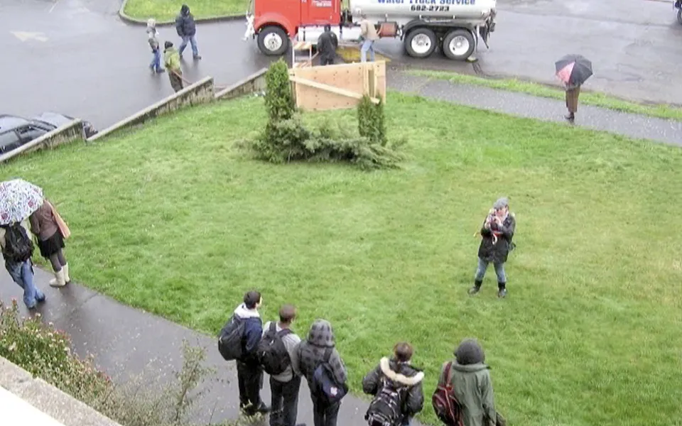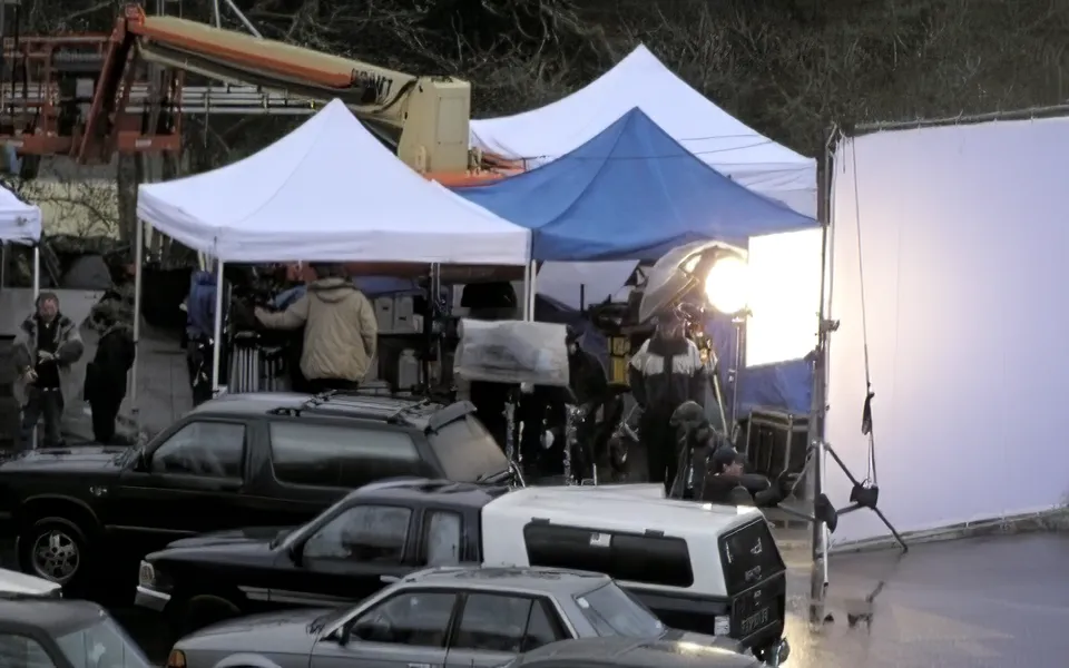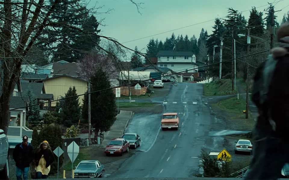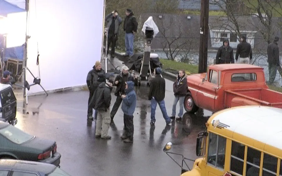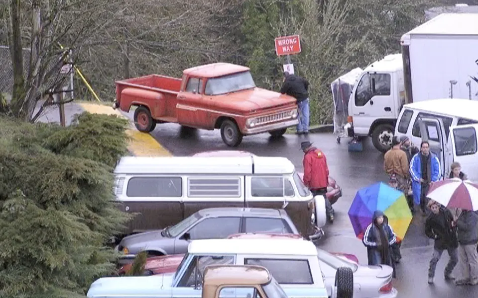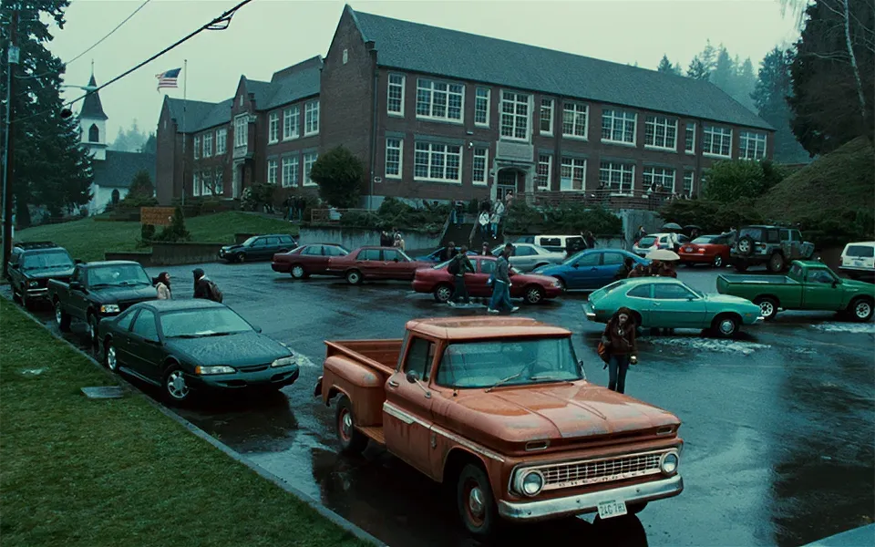 The most iconic setting from the film is undoubtedly this location. It appears in numerous scenes throughout the Twilight saga. The west corner of Kalama High School serves as the primary backdrop, recognized as “Forks High School” in the movies. During the shoot, a Forks HS sign was placed on the lawn in front of the building. While it looked aged and weather-beaten from the front, the back was simply a single piece of plywood. When looking north, the street ascending the hill in the distance is depicted as Bella drives into the parking area. Additionally, the white Catholic Church to the north makes an appearance in the film. This parking lot stands out as one of the most significant filming sites, with many key scenes from the first half of the movie taking place here.