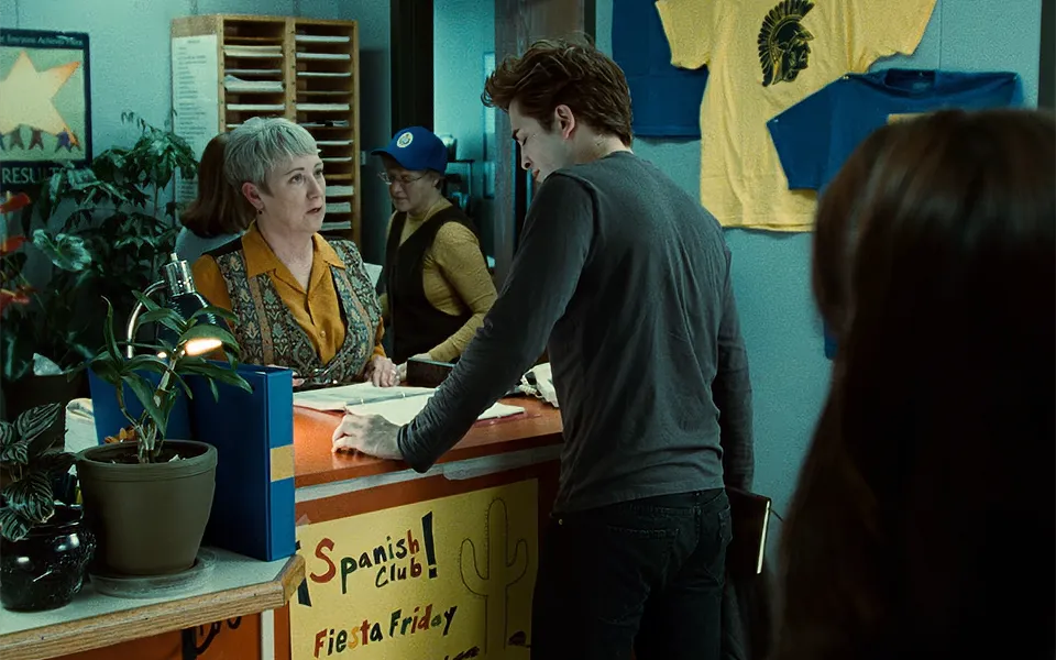 The front side of the High School building features the main entrance into the KHS Office. Director Catherine Hardrich requested to use the main office for a scene in the movie, when Edward attempts to change to a different science class after being partnered with Bella in class. They wanted to use the principal’s office, located inside, so the office was painted blue, Forks’ information was put on the walls, and the scene was attempted, but it was determined to be too small. It never made the movie, but the wall is still blue.
